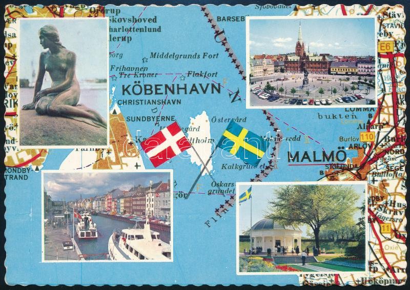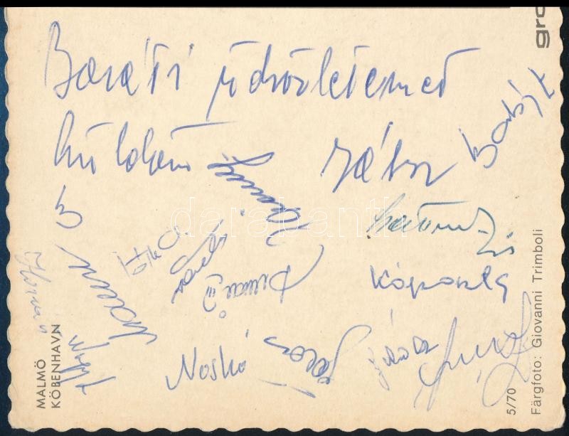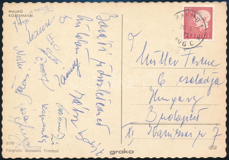 cca 1970 Újpesti Dózsa labdarúgói által Malmőből küldött képeslap a játékosok aláírásával: Káposzta, Dunai, Nagy stb / Autograph signed postacard of the Hungarian football team Ujpesti Dózsa
