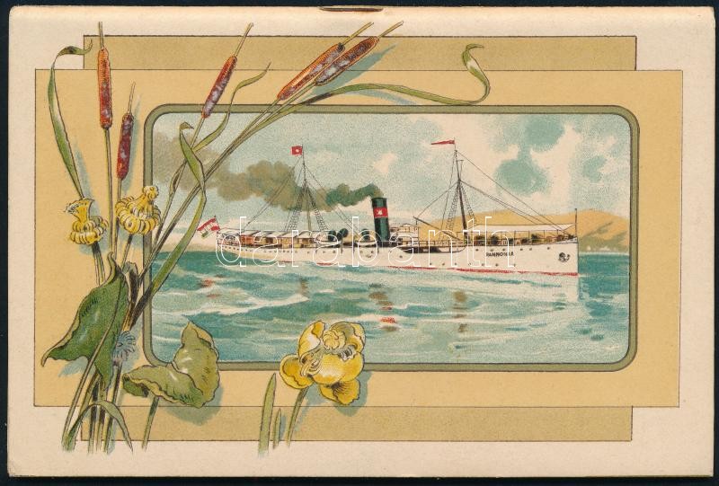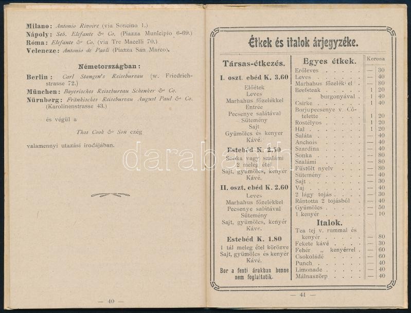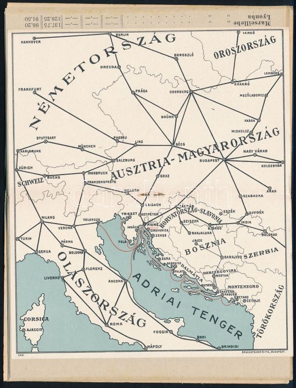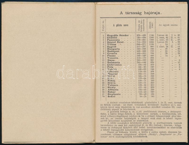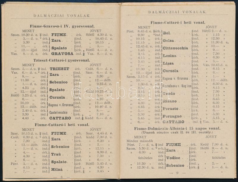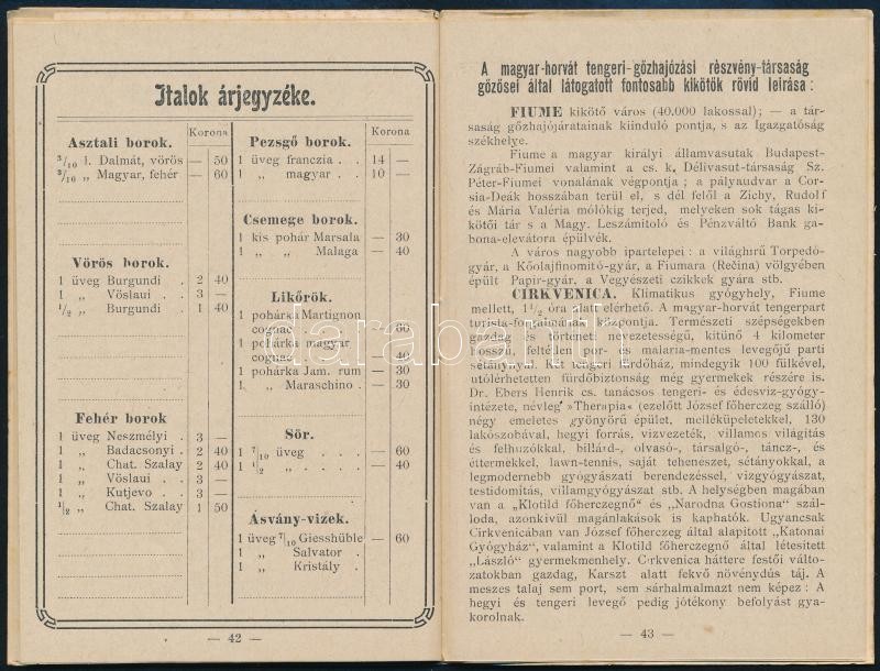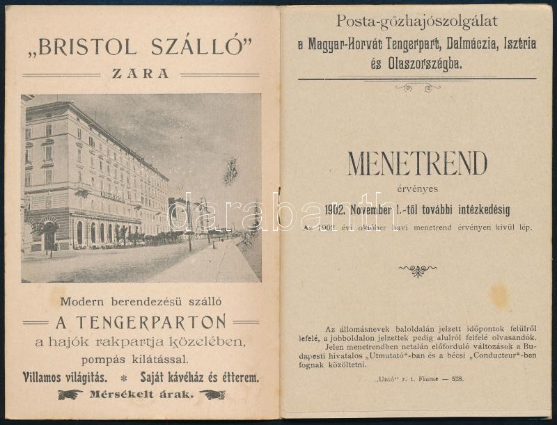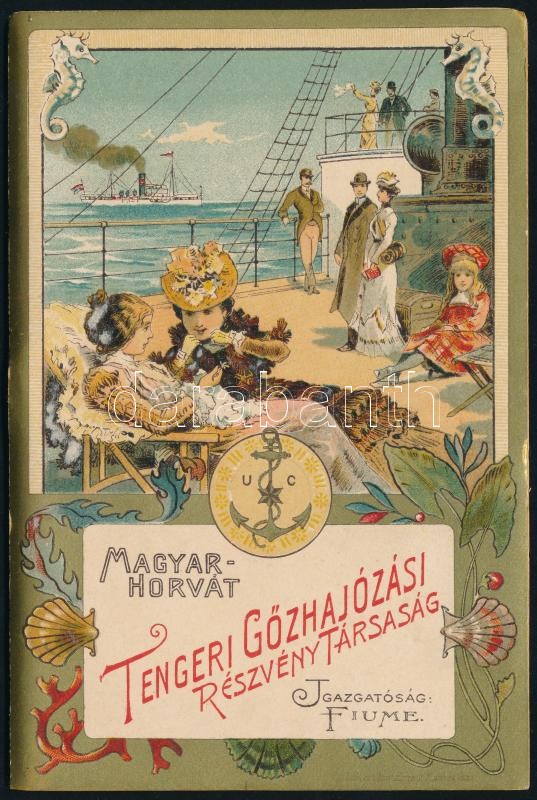 1902 Magyar-Horvát Tengeri Gőzhajózási Rt. Menetrend. Érvényes 1902. November 1.-től további intézkedésig. Az 1902. évi október havi menetrend érvényen kívül lép. Fiume, 1902, "Unió"-ny., 50 p.+1 (kétoldalas térkép) t. Benne korabeli reklámokkal, a társaság hajórajának listájával, a dalmáciai, isztriai, partmenti és az olasz vonalak menetrendjével, kombinált vasuti- és hajójegy árakkal, menetdíjakkal Fiuméból, étel és ital árjegyzékkel, szabályzat kivonattal, a látogatott fontosabb kikötők (városok) leírásával. Magyar nyelven. Kiadói díszesen litografált papírkötésben, a hátsó borítón a Pannónia gőzössel, megkímélt, rendkívül szép állapotban. Ritka, gyűjtői darab. / 1902 Hungarian-Croatian Maritime Steamshipping Company Timetable. Fiume (Rijeka), 1902, Unio, 50 p.+ 1 (map) t. In Hungarian language. With litographed papercover, in Good condition.