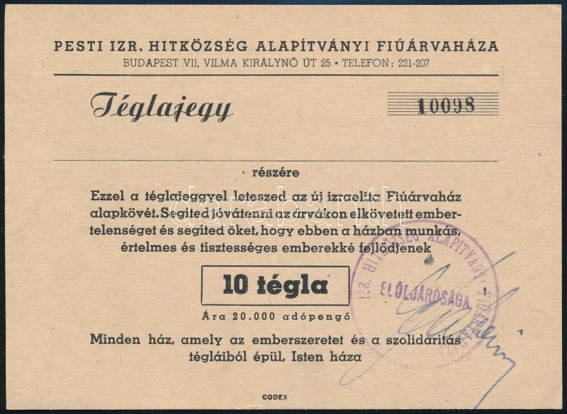 Leírás: A Pesti Izraelita Hitközség Alapítványi Fiúárvaháza részére kiadott téglajegy 20 000 adópengő értékben