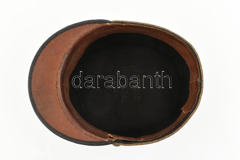 K.u.K. fekete katonai tiszti sapka, 1919-ben a sapkarózsát áthúzták nemzeti szalaggal. Bélésén Budapesti Tiller sapka, Váczi-utca 35 felirattal, belső peremén kisebb sérüléssel, nemzeti szalag kopott/ K.u.K. black military officer cap, the rose on the front was, replaced by Hungarian tricolor in 1919, with small damage in the inner part