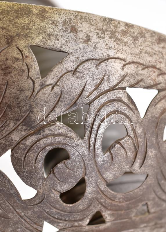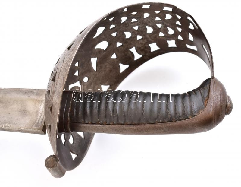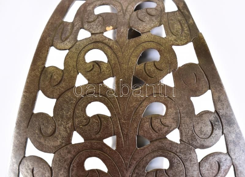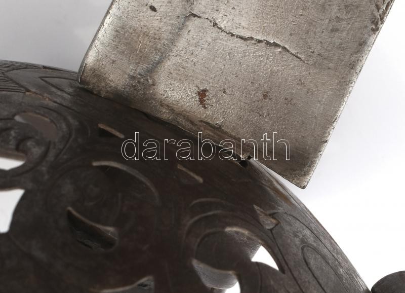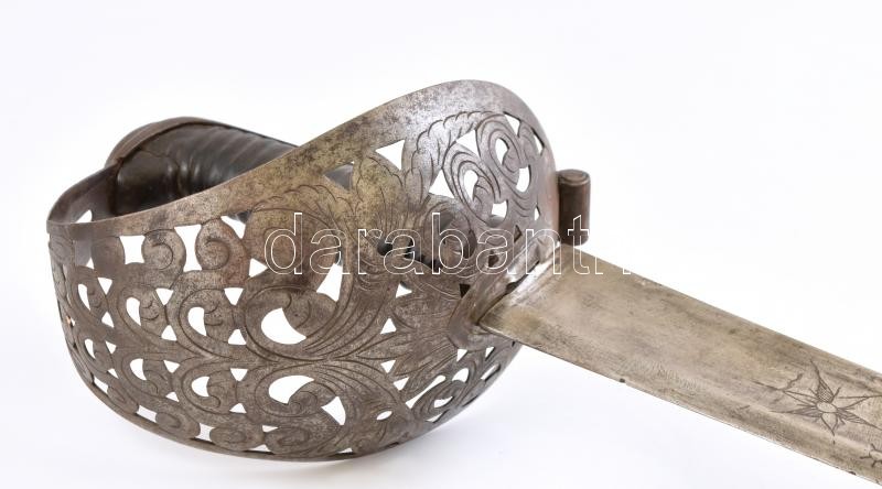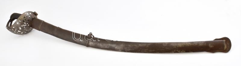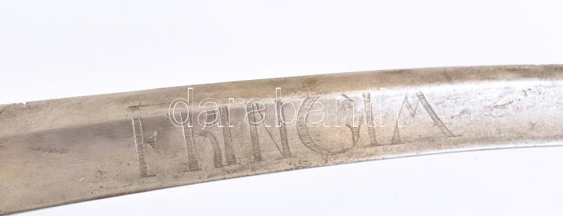 XIX. sz. Fringia huszár szablya. Feliratos, rajzos pengével a Nap, Hold és Esthajnalcsillag ábrázolásával. A Fringia egy nemes acélból készült kard fajta. A nevet magyar nyelvterületen a Rákóczi szabadságharc idejéből eredeztethető Franciscus Rákóczi In Nomine Ggentis Insurgit Armis jelmondattal magyarázzák. A fém hüvelyen 4 rovatkával, mely négy győzelmet jelképez. 1848 körül átalakítva. 100 cm / 19th century Hungary Fringia steel sabre for Hussars 100 cm