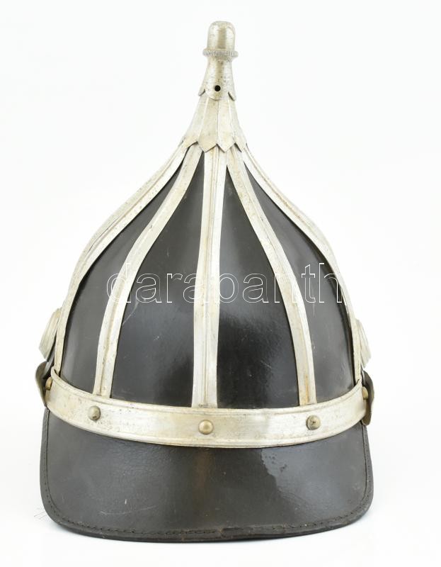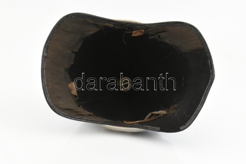 cca 1930 Lovasrendőr Zrinyi sisak, bőr-fém, fém címeres jelvénnyel, oldalán egy-egy db fém magyar koronás gombbal, belsejében Pázmányi szabadalom felvarróval, kopásnyomokkal / cca 1930 Hungarian mounted policeman helmet, leather and metal