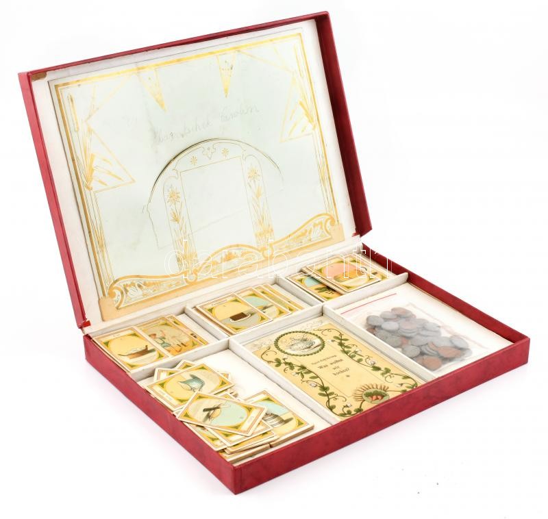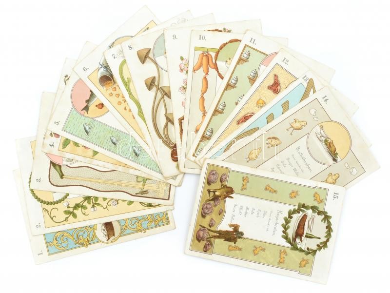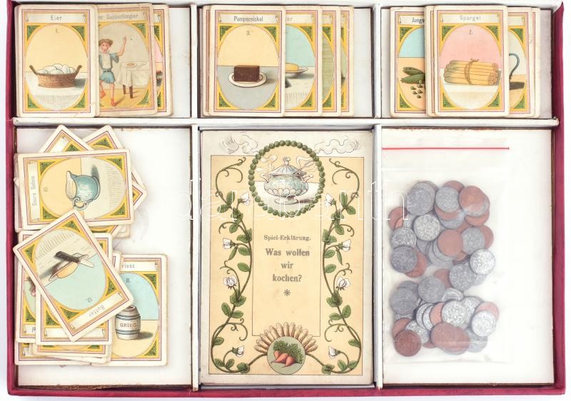 Was wollen wir kochen? Főzős, szakácsos társasjáték cca 1900. Litografált kártyákkal, címkékkel, leírással. Jó állapotban / Cooking board game with litho cards. Seems complete.