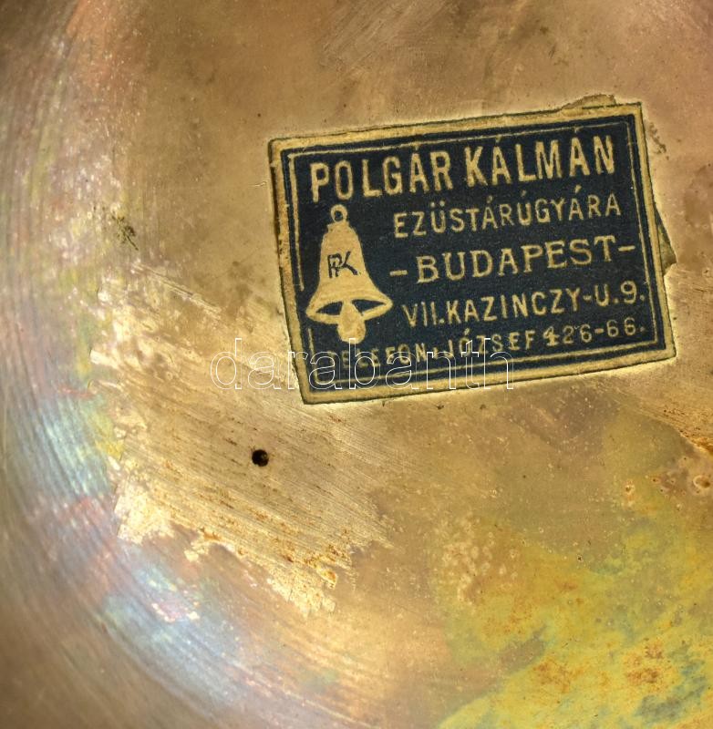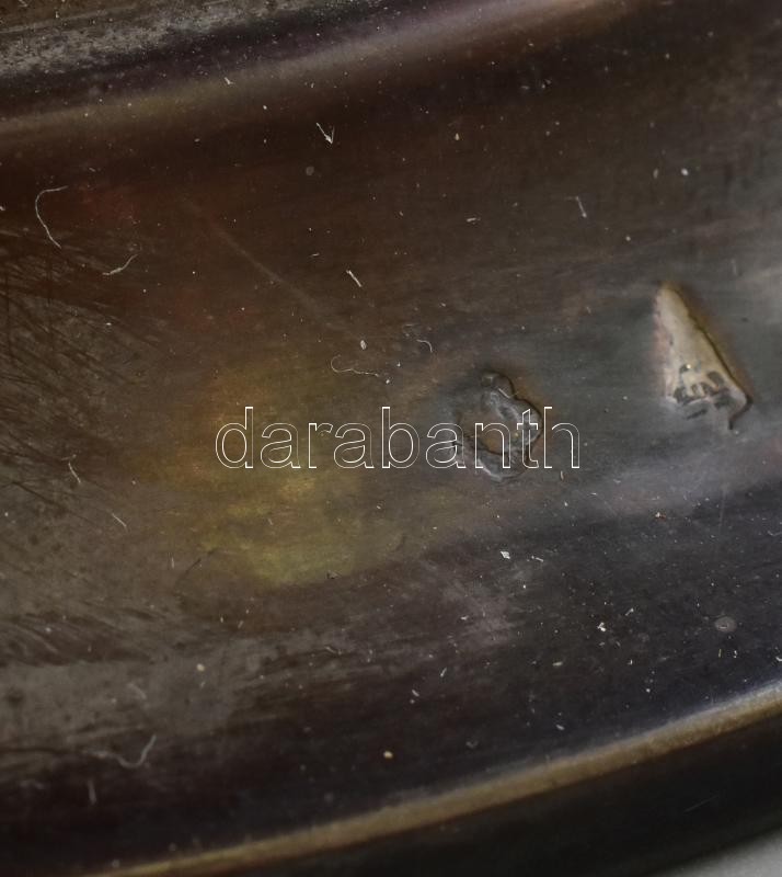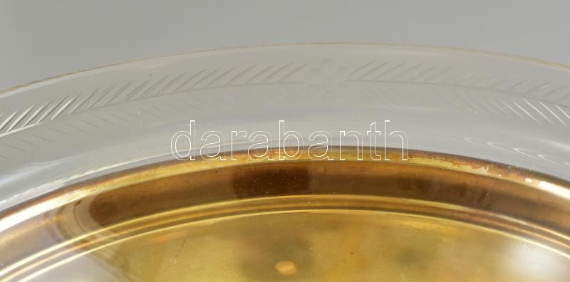 Art deco, ezüst (Ag) kínáló tál. XX. sz. eleje. Polgár Kálmán ezüstárugyára, Jelzett, címkézett ezüst. Belül aranyozott, csiszolt üveg betéttel (egy minimális karccal) Nettó 440 g. d: 20 cm / Silver art deco pan. Marked, with glass inlay. nett: 440 g, d: 20 cm