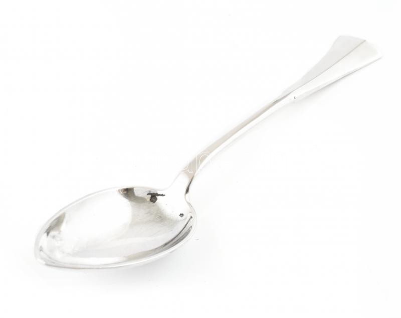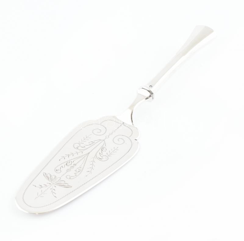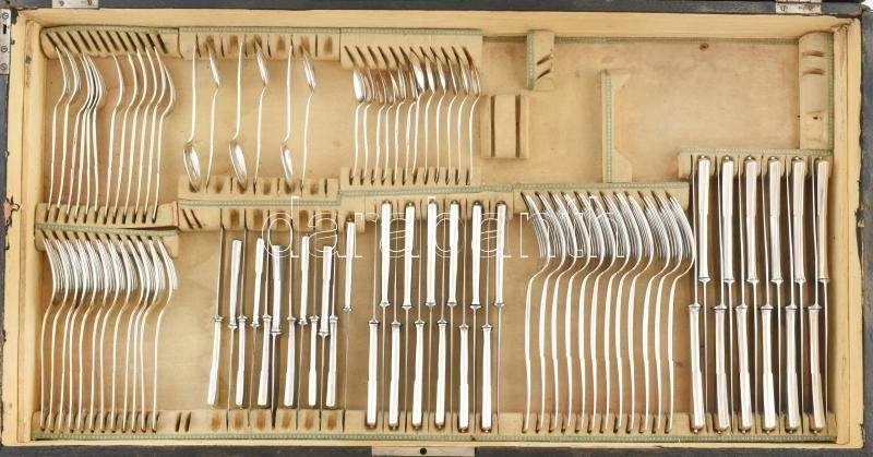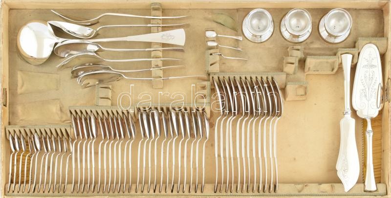 Ezüst (Ag) evőeszköz készlet.12 személyes, sok részes. komplett, díszdobozzal, üvegbetétes fűszertartókkal. Dianás, XIX. sz. vége, magyar. Megviselt díszdoboz. Összesen nettó 4931 g + kések, ezüst nyelű tálaló eszközök.