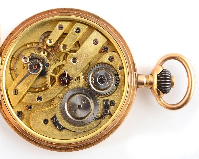 Jaccottet 14K dupla fedeles arany zsebóra. jelzett. Tisztitásra szoruló de jó állapotban. 84,6 g, d: 50 mm / Jaccottet 14C gold pocket watch. Works well. 84,6 g