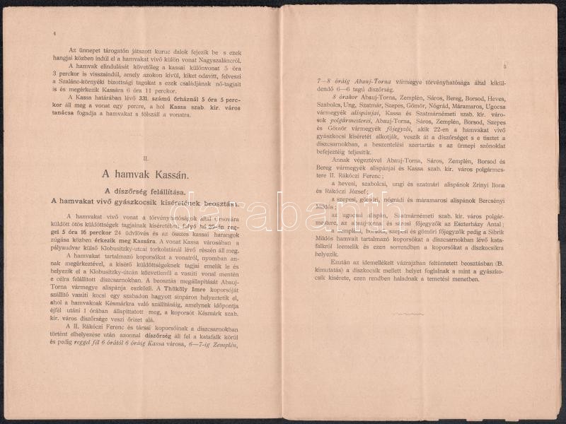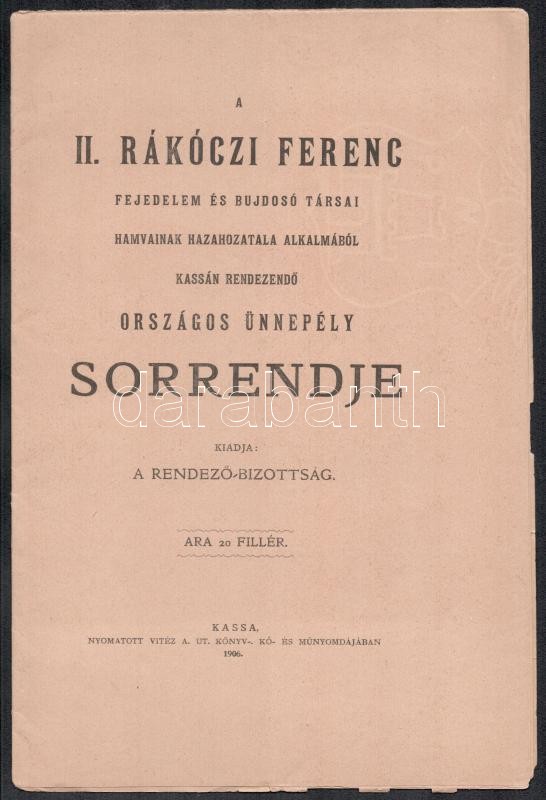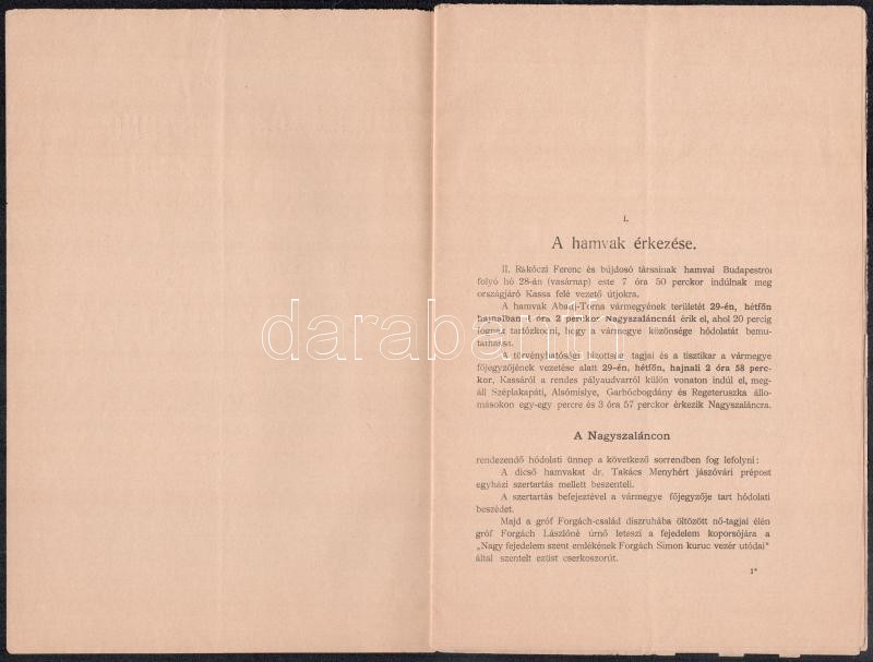 1906 II. Rákóczi Ferenc fejedelem és bujdosó társai hamvainak hazahoza... https://www.darabanth.com/hu/35-Nagyaukcio/35.1/Mutargy-papirregiseg-egyeb/Nyomtatvanyok~14825/1906-II-Rakoczi-Ferenc-fejedelem-es-bujdoso-tarsai-hamvainak-hazahozatala-alkalmabol-Kassan~II2301264