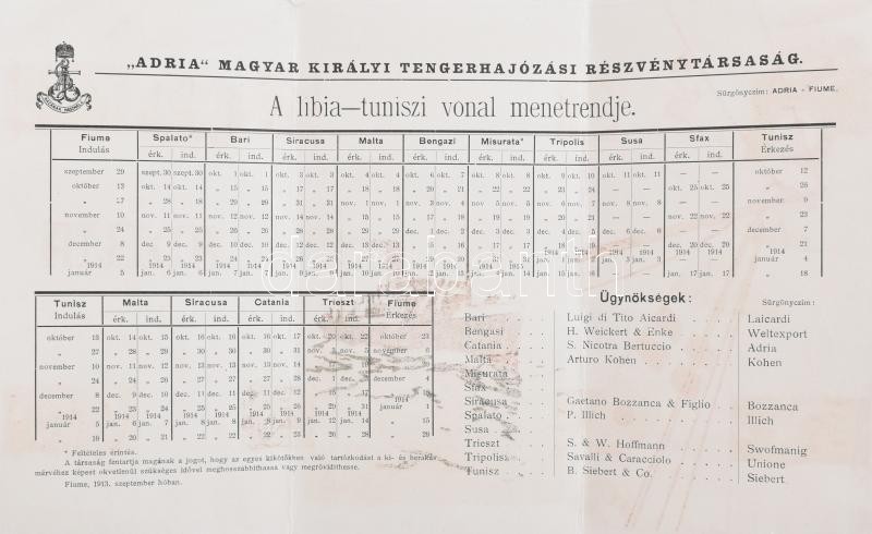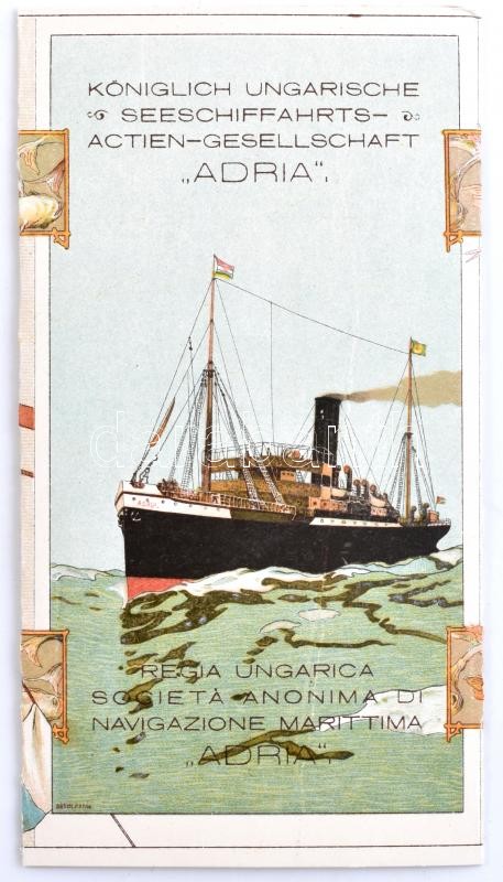 1913 "Adria" Magyar Királyi Tengerhajózási Részvénytársaság ... https://www.darabanth.com/hu/35-Nagyaukcio/35.1/Mutargy-papirregiseg-egyeb/Nyomtatvanyok~14825/1913-Adria-Magyar-Kiralyi-Tengerhajozasi-Reszvenytarsasag-libia-tuniszi-menetrendje-litho~II2365653