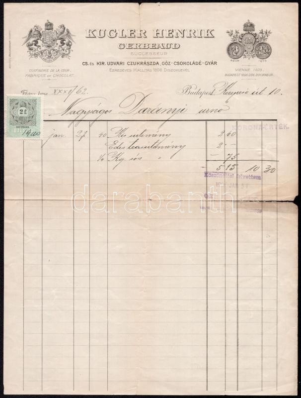 1900 Kugler Henrik Gerbaud Cs. és Kir. Udvari Cukrászda, Gőz- Csokoládé-Gyár fejléces számlája, Darányi Gyuláné Than Jolán (1871-?) részére, 2 f. okmánybélyeggel, szakadt.