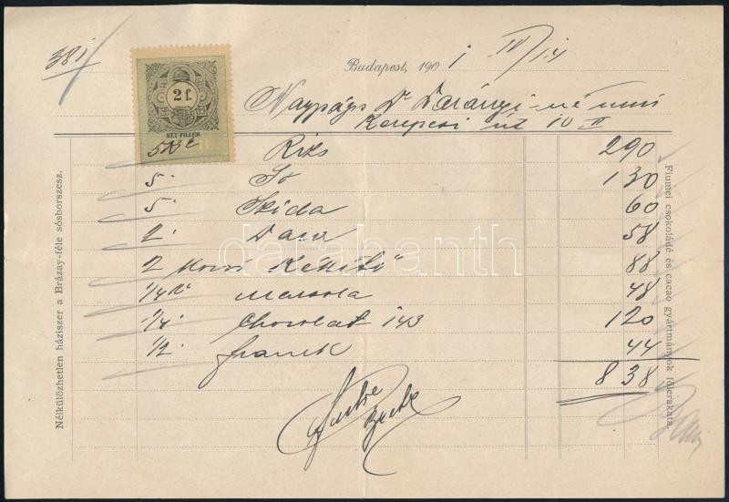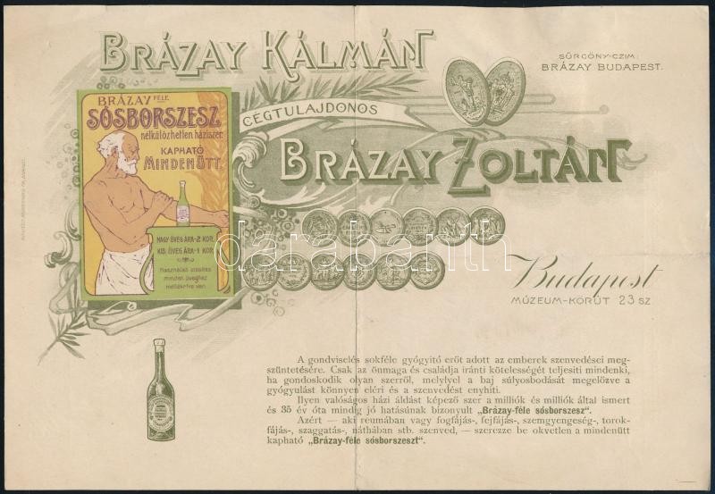 1904 Brázay Kálmán és Brázay Zoltán, Brázay-féle Sósborszesz számla, díszesen illusztrált, rézben színes hátoldallal, Darányi Gyuláné Than Jolán (1871-?) részére, 2 f. okmánybélyeggel.