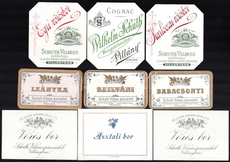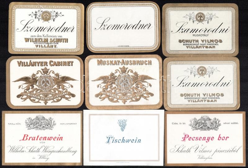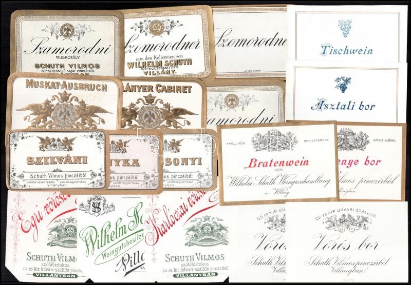 18 db Schuth Vilmos Villány boros címke, cs.. és kir. udvari szállító, 1900 körül / Wilhelm Schuth Willand (Villány), k. u. k. Hoflieferant, wine labels, 18 pcs