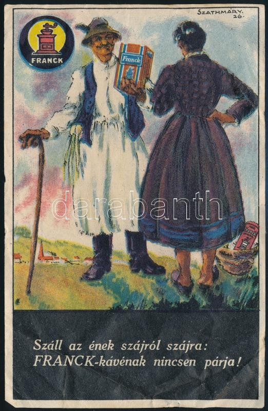 Leírás: 1926 "Száll az ének szájról szájra: Franck-kávénak nincsen párja!", Franck kávépótlék reklám, jelzett a nyomaton (Szathmáry 26.), Bp., Klösz Gy.-ny., gyűrődés nyomokkal, 17x11 cm