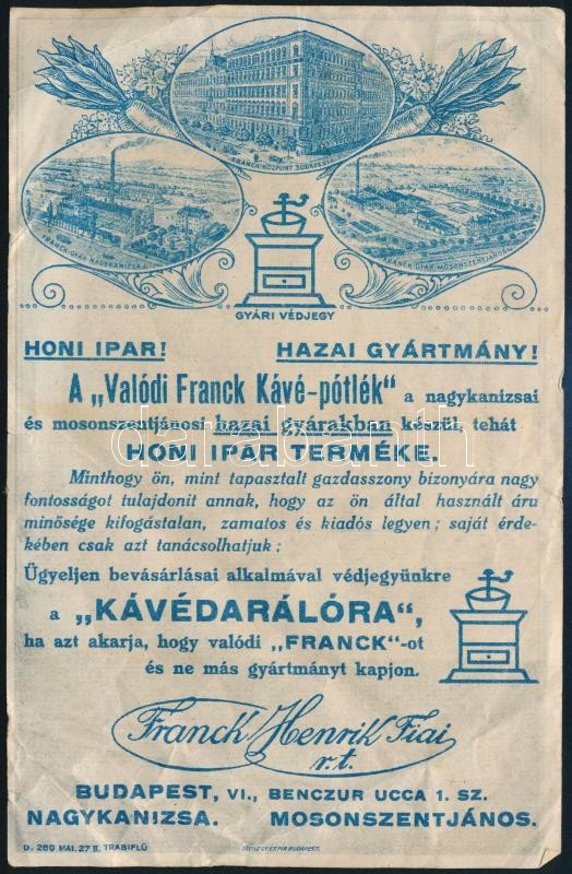 1926 "Száll az ének szájról szájra: Franck-kávénak nincsen párja!... https://www.darabanth.com/hu/35-Nagyaukcio/35.1/Mutargy-papirregiseg-egyeb/Reklam~14818/1926-Szall-az-enek-szajrol-szajra-Franck-kavenak-nincsen-parja-Franck-kavepotlek-re~II2321147