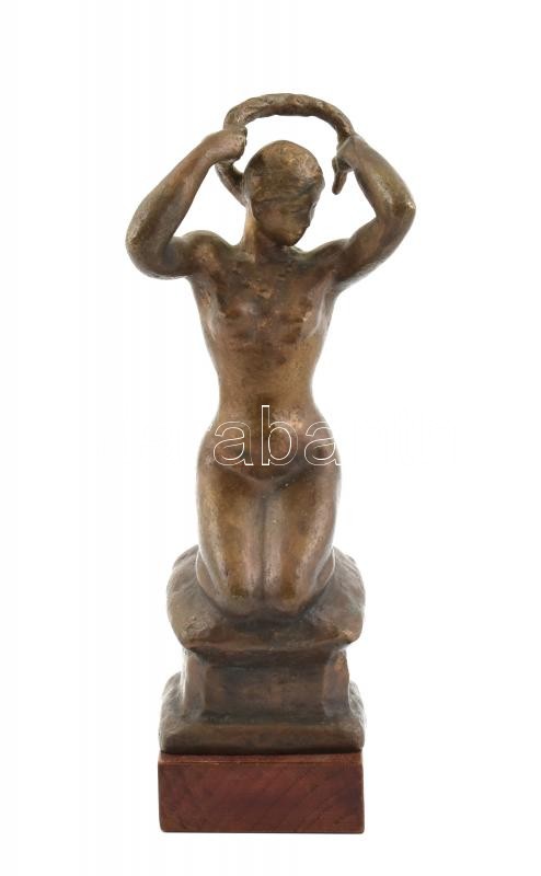 Leírás: Medgyessy Ferenc (1881-1958): Kontyot kötő lány. Bronz. Jelzett. fa talapzaton. m: 29 cm / Bronze statue on wooden pedestal, signed, height: 29 cm