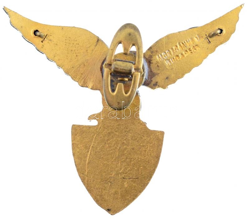 ~1900. "Sas kör" aranyozott, részben zománcozott Br sasos gomblyukjelvény, hátoldalán "MORZSÁNYI U. BUDAPEST" gyártói jelzéssel (40x48mm) T:2 kis zománchiba / Hungary ~1900. "Sas kör" gilt, partially enamelled Br eagle-shaped button badge, on the back with makers mark "MORZSÁNYI U. BUDAPEST" (40x48mm) C:XF