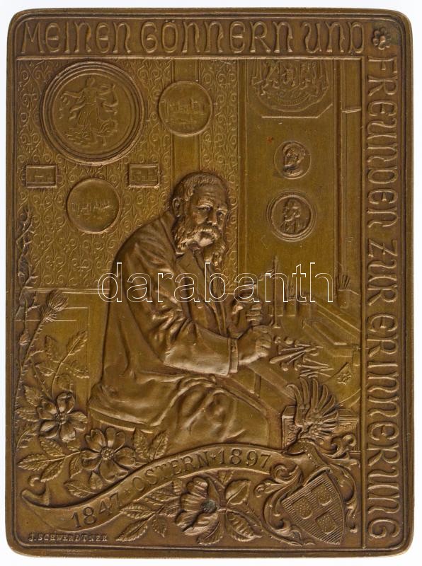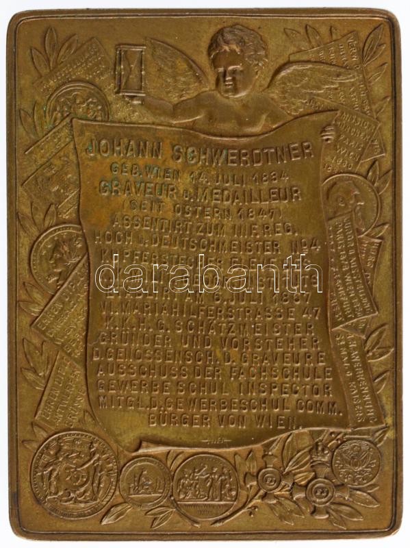 Ausztria 1897. Johann Schwerdtert ábrázoló kétoldalas Br emlékplakett, előlapon az éremművész, hátlapon életének fontosabb eseményeinek felsorolásával, munkásságnak 50. évfordulója alkalmából "MEINER GÖNNERN UND FREUNDEN ZUR ERINNERUNG - 1847 OSTERN 1897 / JOHANN SCHWERDTNER GEB WUEB 14. JULI 1834 GRAVEUR U. MEDAILLEUR (SEIT OSTERN 1847)...". Szign.: Johann Schwerdter (66,82g/60x45mm) T:1-,2 / Austria 1897. Double-sided Br plaque, commemorating the 50th anniversary the work of Johann Schwerdter, on the obverse self-portrait, on the reverse listing of the milestones of his career "MEINER GÖNNERN UND FREUNDEN ZUR ERINNERUNG - 1847 OSTERN 1897 / JOHANN SCHWERDTNER GEB WUEB 14. JULI 1834 GRAVEUR U. MEDAILLEUR (SEIT OSTERN 1847)...". Sign.: Johann Schwerdter (66,82g/60x45mm) C:AU,XG