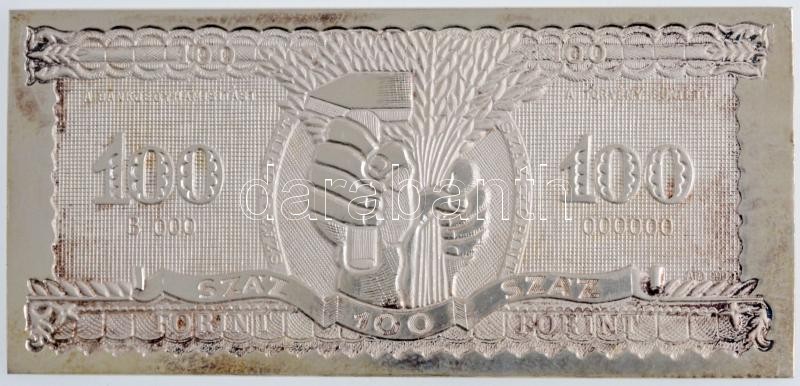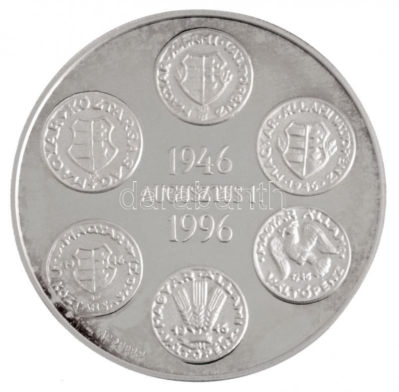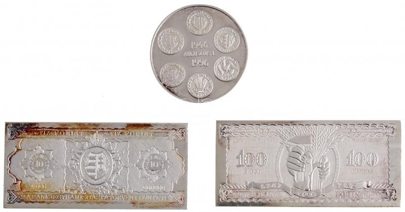 1996. "50 éves a forint" 3db-os emlékérem szett eredeti, kék bársony bélésű dísztokban, sorszámozott tanúsítvánnyal: "1946. 10Ft" Ag bankjegy veret (47,61g/0.999/37,5x80mm) + "1946. 100Ft" Ag bankjegy veret (47,19g/0.999/37,5x80mm) + "50 éves a forint / 1946. augusztus 1. - 1996" Ag emlékérem (31,47g/0.999/42,5mm) T:1- (BU,PP) felületi karc, patina Hungary 1996. "50th Anniversary of Forint" 3pcs of commemorative medallions in original case, with numbered certificate: "1946. 10 Forint" Ag banknote plaque (47,61g/0.999/37,5x80mm) + "1946. 100 Forint" Ag banknote plaque (47,19g/0.999/37,5x80mm) + "50th Anniversary of Forint" Ag medallion (31,47g/0.999/42,5mm) C:AU (BU,PP) surface scratch, patina