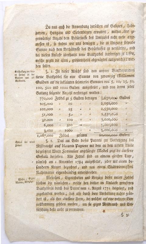 Bécs 1784. Udvari leirat a Bécsi városi bankócédulák (Wiener-Stadt Banco-Zettel) 1784-es sorozatának kibocsátásáról, német nyelven. A mellékletben a 10-25-50-100-500-1000G bankjegyek formuláréjával, merített papír alapú lapon, rendkívül szép állapotban megőrizve. / Vienna 1784. Royal Announcment about the issue of the new series of the Wiener-Stadt Banco-Zettel Gulden banknotes in german language. Appendix with the Formulare of the new banknote series with the denominations of 10-25-50-100-500-1000 Guldens. In exceptionally well preserved condition.