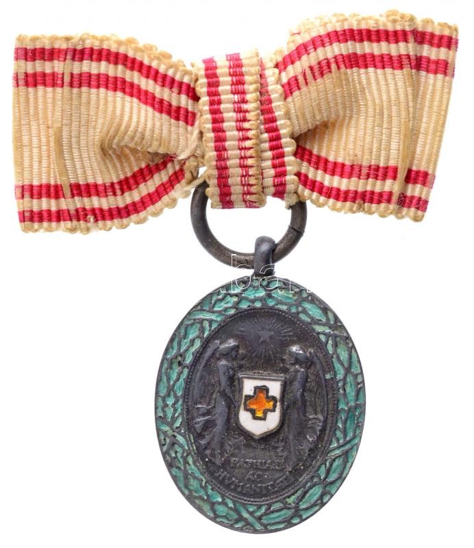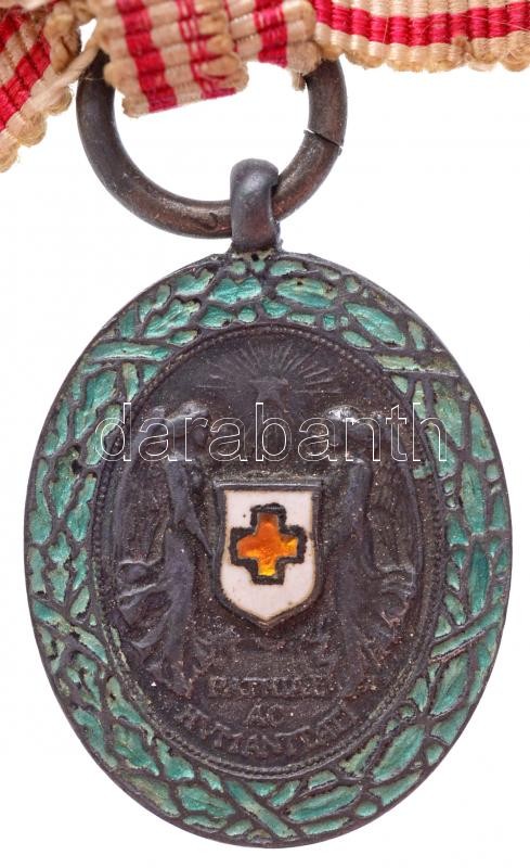 1915. "Vörös Kereszt Ezüst Díszérme hadidíszítménnyel" kitüntetés miniatűrje csokorszalagon T:2 patina / Hungary 1915. Miniature badge with women's ribbon of the "Red-Cross Silver Medal with Military Ornament" C:XF patina