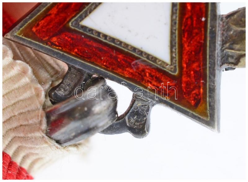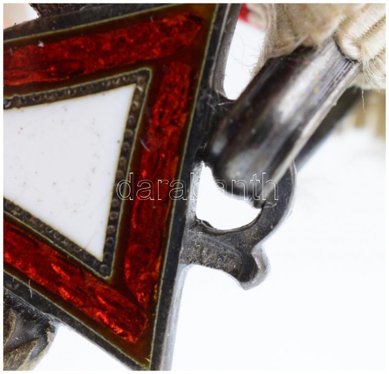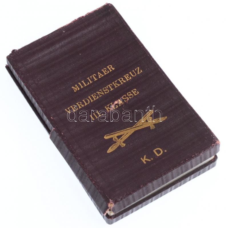 1916. "A Katonai Érdemkereszt III. Osztálya hadidíszítménnyel és kardokkal" fülön jelzett, zománcozott Ag kitüntetés mellszalagon, eredeti, sérült adományozói tokban T:2 zománchiba, hátlapi medallion ragasztása javítva? / Hungary 1916. "Military Merit Cross, 3rd Class with war decoration" enamelled Ag decoration on ribbon, hallmarked on the ring, in original, damaged case C:XF enamel error, reverse medallion gluing repaired? NMK 175.