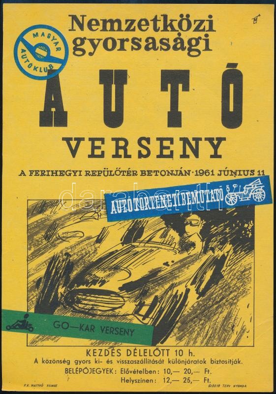 1961 Nemzetközi gyorsasági autós verseny a Ferihegyi repülőtér betonján. Villamosplakát kis hajtásnyommal a szélén. / International car race in Ferihegy airport. Poster 24x16 cm