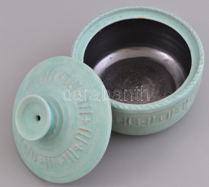 Leírás: Gádor István (1891-1984): Türkiz színű tál fedéllel, absztrakt motívumokkal díszített, mázas kerámia, hibátlan, d: 15,5 cm, m: 13 cm / glazed earthenware (ceramic), in flawless condition