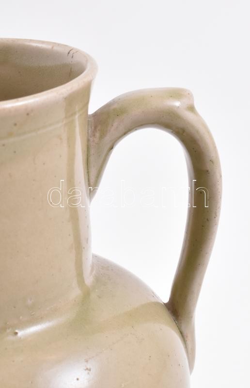 Leírás: Zsolnay vizes kancsó. Mázas keménycserép. Jelzett (benyomott Zsolnay Pécs) XIX. sz. vége. Kopásokkal, alján egy repedéssel. 20 cm