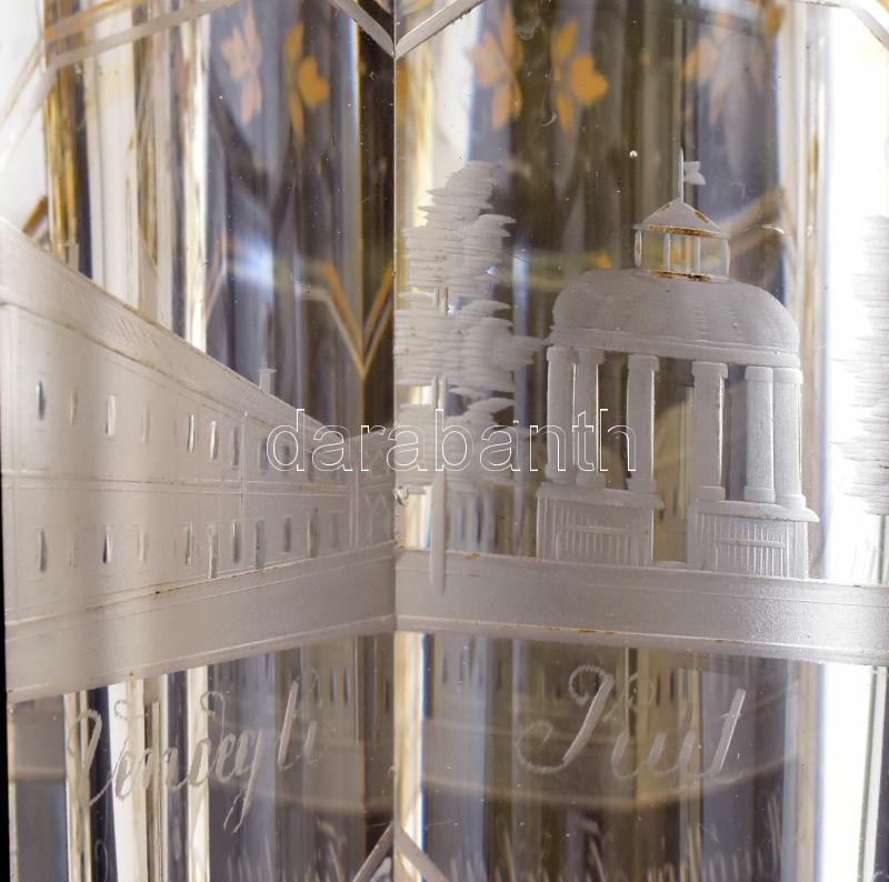 Antik Balatonfüredi talpas emlék pohár a vendéglő, kút, Horvátház és a Fürdőház képeivel és felirataival. Kézzel festett, metszett, formába öntött üveg pohár. Kopásokkal. 17 cm / Balatonfüred commemoratíve glass.