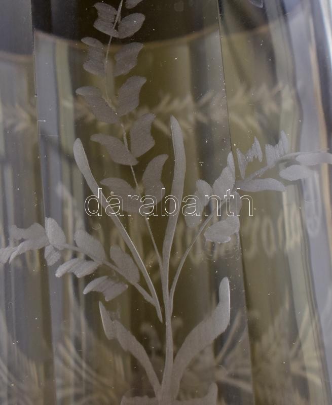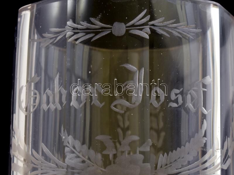 Leírás: Antik emlék pohár metszett "Gabor Josef" felirattal és virág dekorral. Kopásokkal, alján karcolásokkal. M: 10,5 cm, d: 6,5 cm / commemoratíve glass.