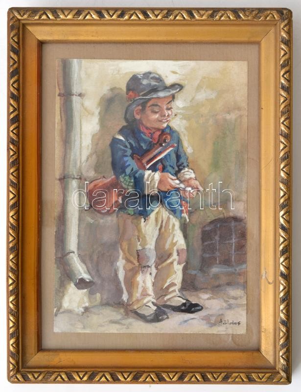 Leírás: Földes Imre (1881-1948): A kis muzsikus, akvarell, papír, jelzett, üvegezett fa keretben,keret: 20x15 cm, 14,5x10,5 cm