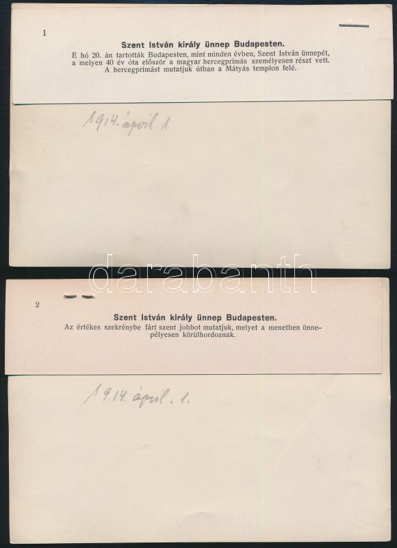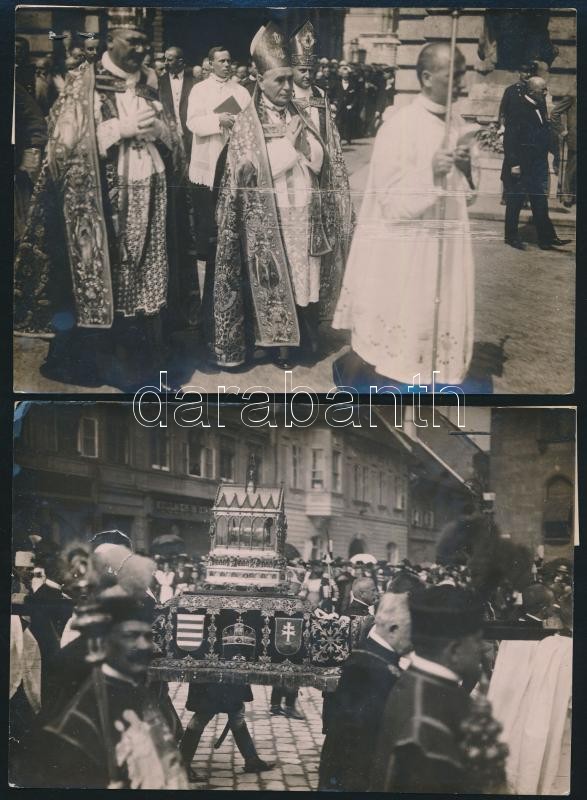 Leírás: 1914 Csernoch János hercegprímás a Szent István napi körmeneten, 2 db korabeli sajtófotó hozzátűzött szöveggel / press photo 16x12 cm
