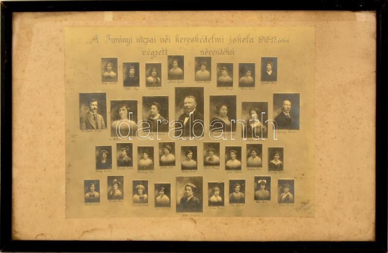 1917 Bp., Jurányi utcai Női Kereskedelmi Iskola 1916-197. évben végzett növendékei, fotó kartonon, Bp., Goszleth J és Fia műterméből, üvegezett fa keretben, foltos, 27x33 cm