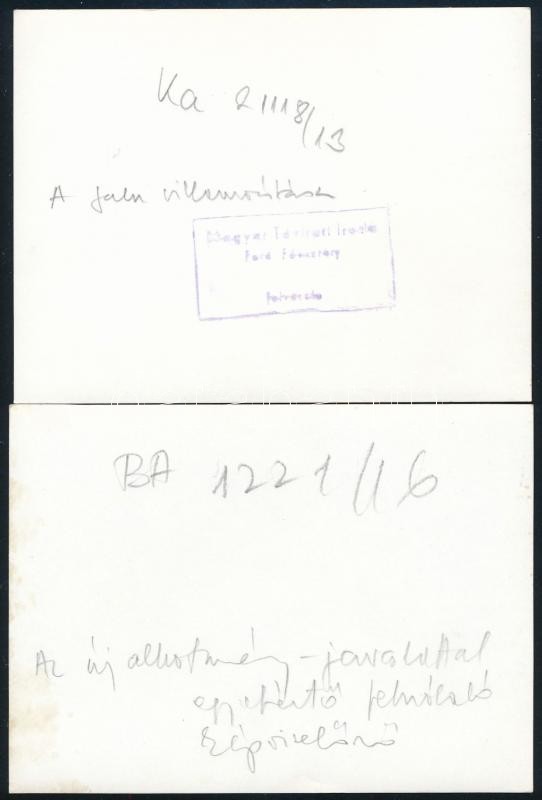 Leírás: 2 db propagandafotó (A falu villamosítása, az új alkotmányjavaslattal egyetértő képviselő), feliratozott sajtófotók, 9×12 cm