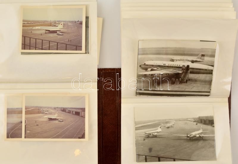 cca 1950-1970 Nagyrészt repülőgépeket (pl.: Tu-144-et) ábrázoló Malévos, Ferihegyi repülőtéren készült fotó, kb. 80-90., berakóban, 6x9 cm és 9x14 cm közötti méretben
