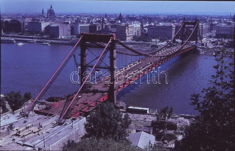 Leírás: cca 1964 Budapest, az új Erzsébet híd építéséről készült. professzionális minőségű színes dia, 6x9 cm