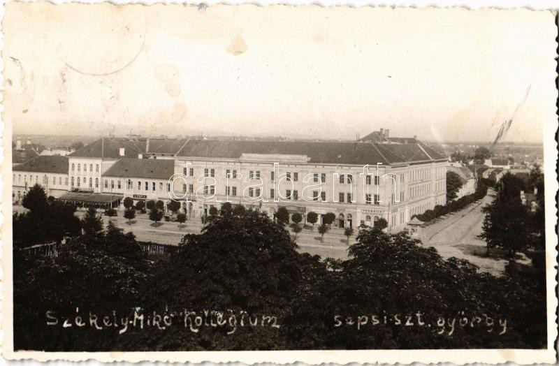 1943 Sepsiszentgyörgy, Sfantu Gheorghe; Székely Mikó Kollégium, Klein, Benke, Féder, Dézsi János, Dr. Barabás, Ehrlich üzlete, Gyógyszertár, bal oldalt háttérben a zsinagóga / Calvinist high school, college, shops, pharmacy, synagogue on the left side in the distance. photo (fl)