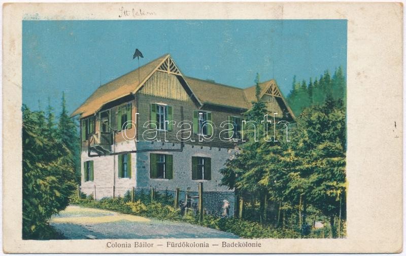 Leírás: Szentkeresztbánya, Minele Lueta (Szentegyháza, Vlahita); Colonia Bailor / Fürdőkolónia. Kiadja Kamner & Jekelius / Badekolonie / spa colony, bathing house (ázott / wet damage)