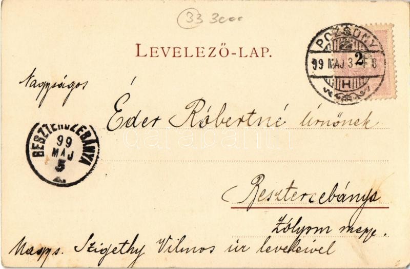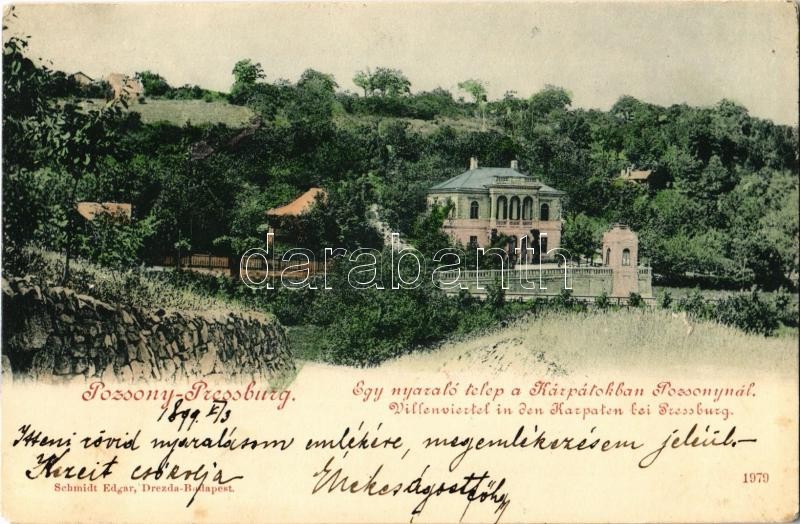 1899 Pozsony, Pressburg, Bratislava; Egy nyaralótelep a Kárpátokban Pozsonynál. Schmidt Edgar kiadása / Villenviertel in den Karpaten bei Pressburg / villa (kis sarokhiány / small corner shortage)