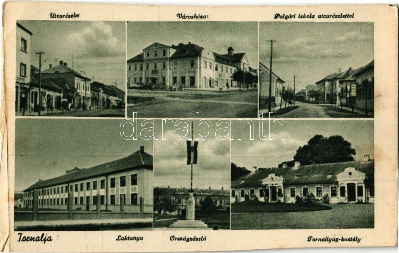Tornalja, Tornaalja, Tornala; utca, üzletek, Városháza, Polgári iskola, Laktanya, Országzászló, Tornallyay kastély. Kiadja Linassi Aurél / street view, shops, town hall, school, military barracks, Hungarian flag, castle (vágott / cut)