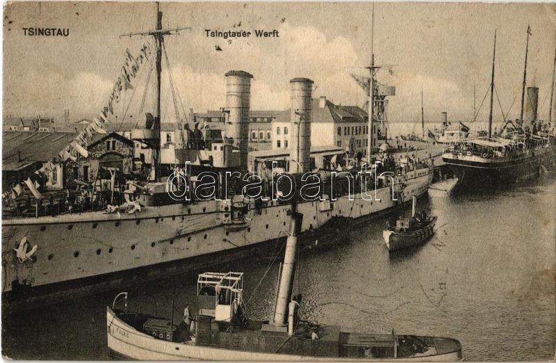 Qingdao, Tsingtau, Kiautschou Bay concession; warship with drying clot... https://www.darabanth.com/hu/350-Gyorsarveres/350.0/Kepeslapok/Hadihajo~2500050/Qingdao-Tsingtau-Kiautschou-Bay-concession-warship-with-drying-clothes-and-Falke-steam-barge-E~II1993613