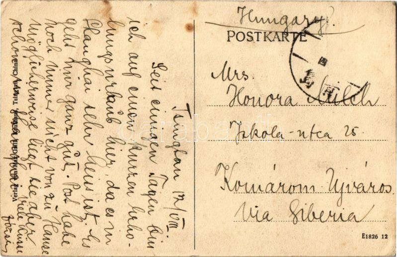 Leírás: Qingdao, Tsingtau, Kiautschou Bay concession; warship with drying clothes and "Falke" steam barge (EK)