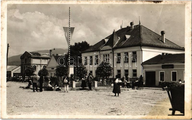 Nagyberezna, Velykyi Bereznyi, Velky Berezny; Állami iskola és az Országzászló, zsinagóga, Ungvölgyi Bank Rt., piaci árusok. Kiadja Babics Józsefné / school, Hungarian flag, synagogue, bank, market vendors, Judaica (fa)