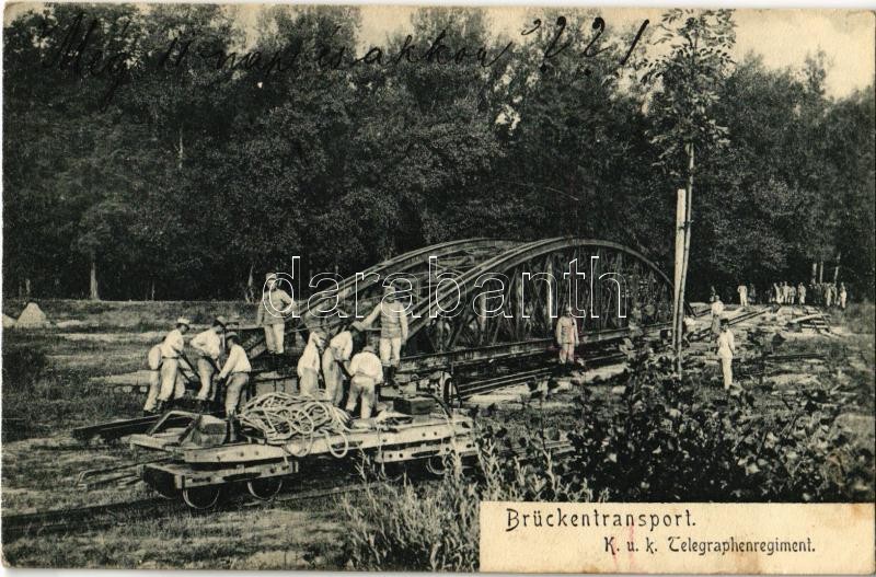 1909 Cs. és kir. távirati ezred híd szállítás közben / Brückentransport. K.u.K. Telegraphenregiment / Austro-Hungarian Telegraphy Regiment, transporting a bridge on field railway