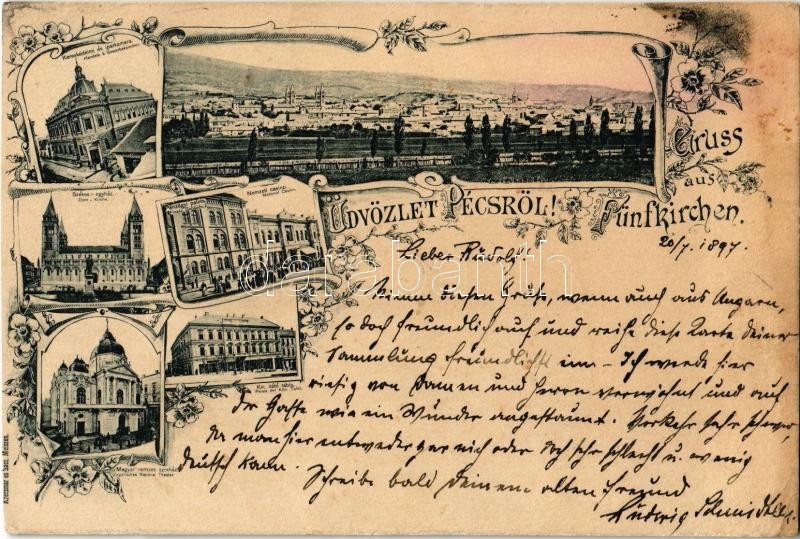 1897 (Vorläufer!!!) Pécs, Kereskedelmi és Iparkamara, Székesegyház, Nemzeti Casino (kaszinó), Magyar Nemzeti Színház, Kir. Ítélőtábla. Krecsmar és Sacz. Art Nouveau, floral (fl)