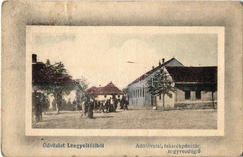 Leírás: 1923 Lengyeltóti, Adóhivatal, Takarékpénztár, Nagyvendéglő, étterem (Rb)