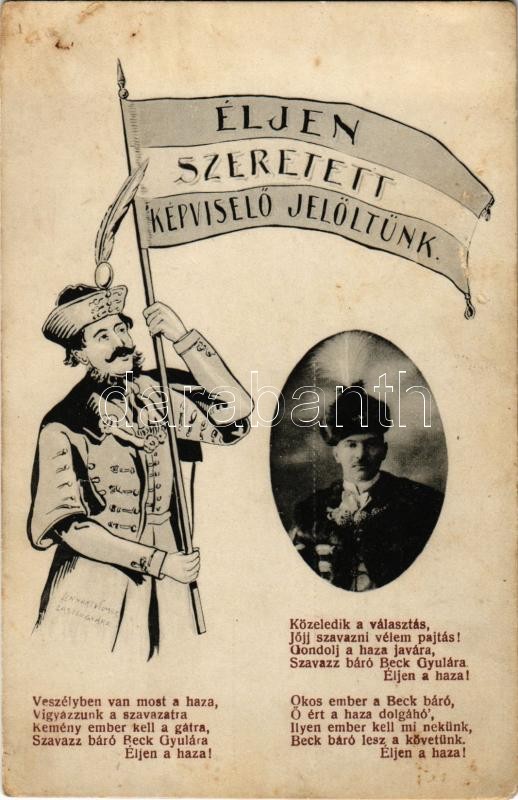 Éljen szeretett képviselő jelöltünk! Báró Madarassy-Beck Gyula bankár. Linhart Vilmos Zászlógyára / election campaign for a Hungarian parliamentary representative