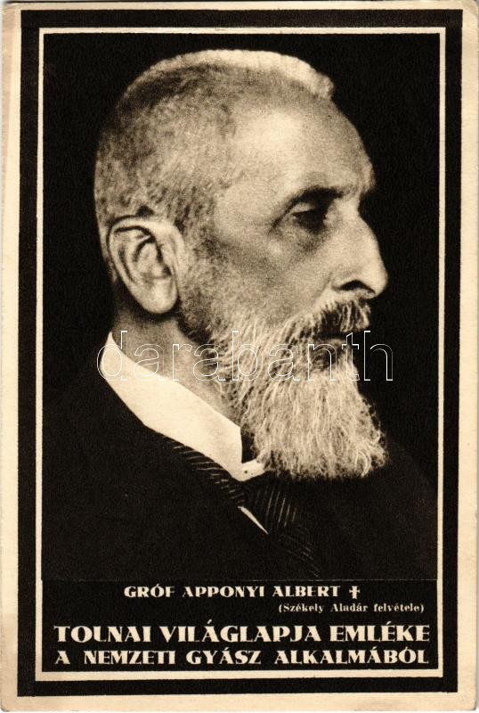 Gróf Apponyi Albert gyászlapja. Tolnai Világlapja emléke a nemzeti gyász alkalmából. Székely Aladár felvétele, hátoldalon információ / obituary card of Albert Apponyi (EK)