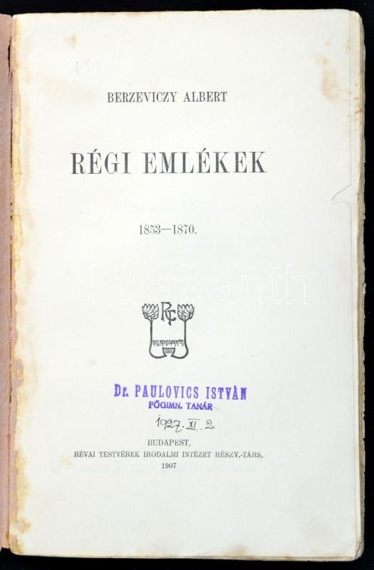 Leírás: Berzeviczy Albert: Régi emlékek 1853-1870. Bp., 1907, Révai, 314+2 p. Kiadói papírkötésben, a borítón kis szakadással.