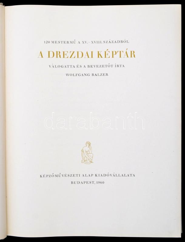 A Drezdai Képtár. 120 mestermű a XV. - XVIII. századból. Válogatta és a bevezetőt írta Wolfgang Balzer. Bp., 1960, Képzőművészeti Alap Kiadóvállalata. Kiadói egészvászon kötés, jó állapotban.