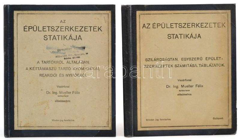 Az épületszerkezetek statikája. A tartókról általában, a kéttámaszú tartó nyomatékai, reakciói és nyíróerői.; Szilárdságtan egyszerű épületszerkezetek számítása. Táblázatok. Vezérfonal(ak) Dr. Ing. Mueller Félix építész-tanár előadásáihoz. 2 db gépelt jegyzet, félvászon-kötésben,124+144 p.